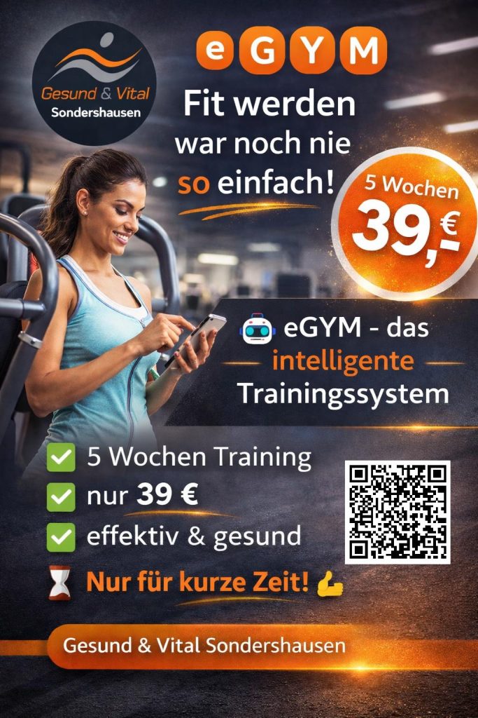 Herzlich Willkommen! Entdecke, wie wir deine Fitnessreise unterstützen können und erlebe eine einzigartige Atmosphäre, die dich motiviert und inspiriert. Trainieren kannst du überall – aber deine Ziele erreichst du bei uns im Gesund & Vital Sondershausen! Schau dich auf unserer Website um und lass dich von unserem vielfältigen Angebot überzeugen.